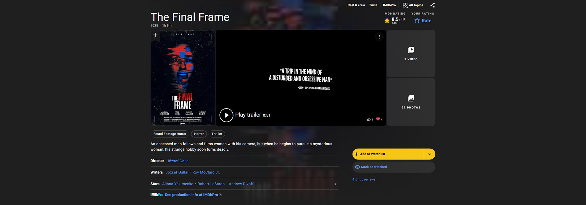 Designed the official poster for the horror-thriller The Final Frame, directed by József Gallai and starring Robert LaSardo, Andrew Divoff, and Aljona Yakimenko. The poster was officially published on both IMDb and Rotten Tomatoes as part of the film’s promotional release.